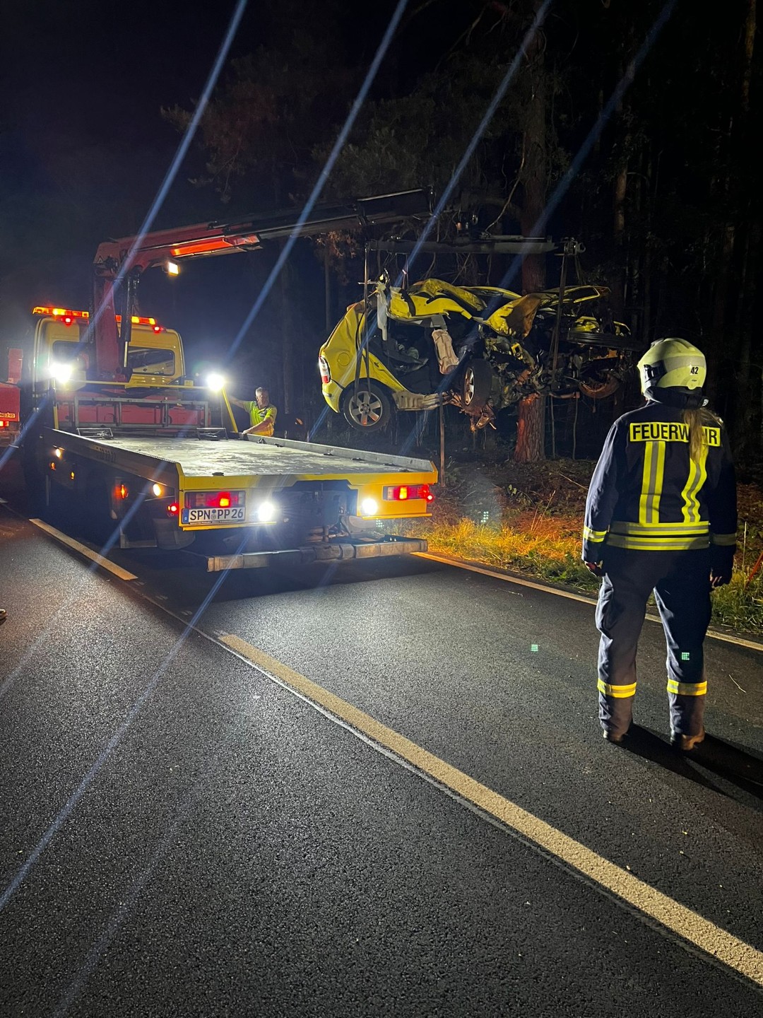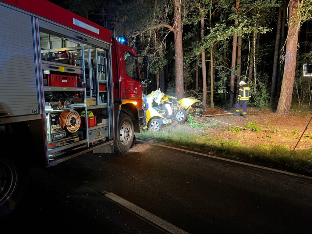Vor Ort bestätigte sich die gemeldete Lage: Ein Pkw war von der Fahrbahn abgekommen und frontal gegen einen Baum geprallt. Die Fahrerin bzw. der Fahrer konnte sich zwar selbstständig aus dem Fahrzeug befreien und wurde zunächst von einem Ersthelfer betreut, benötigte jedoch dringend medizinische Versorgung.
