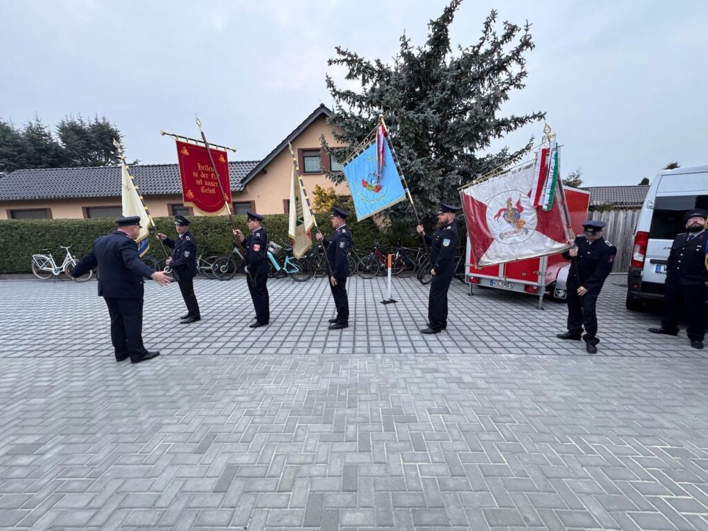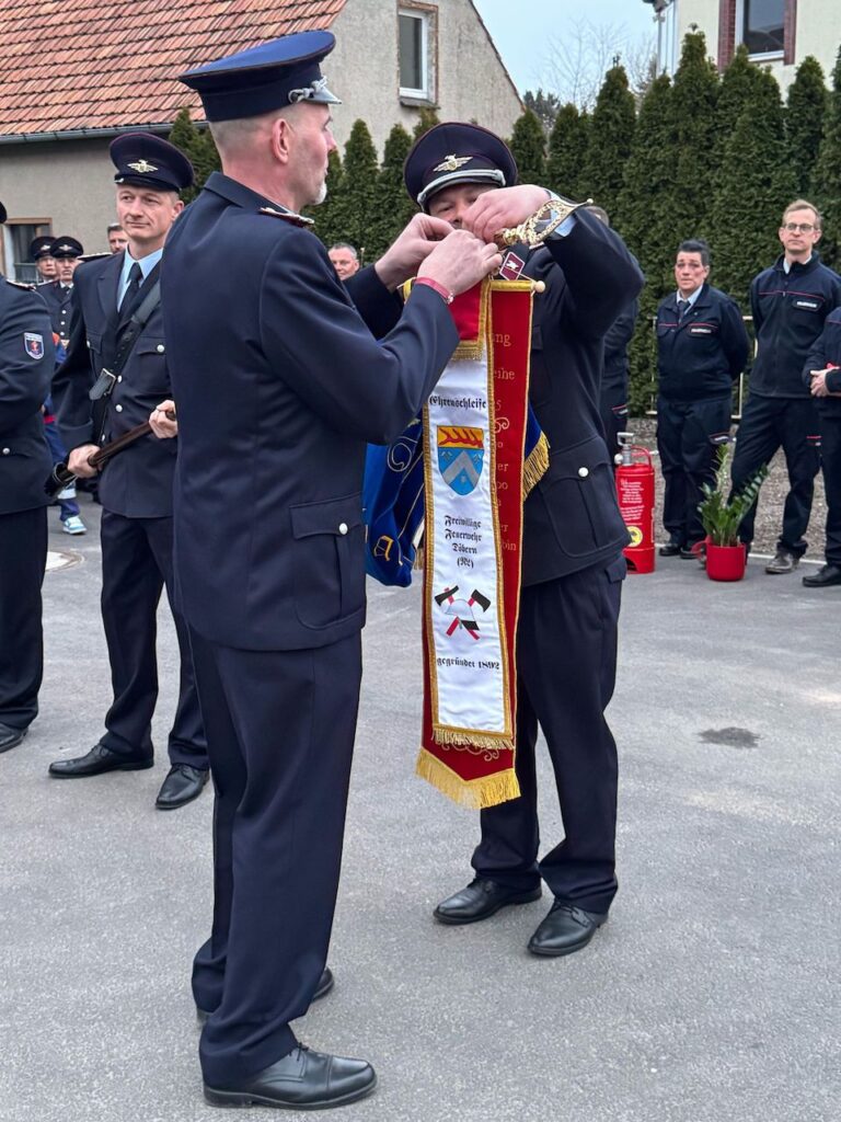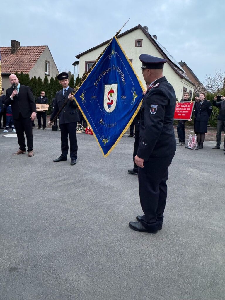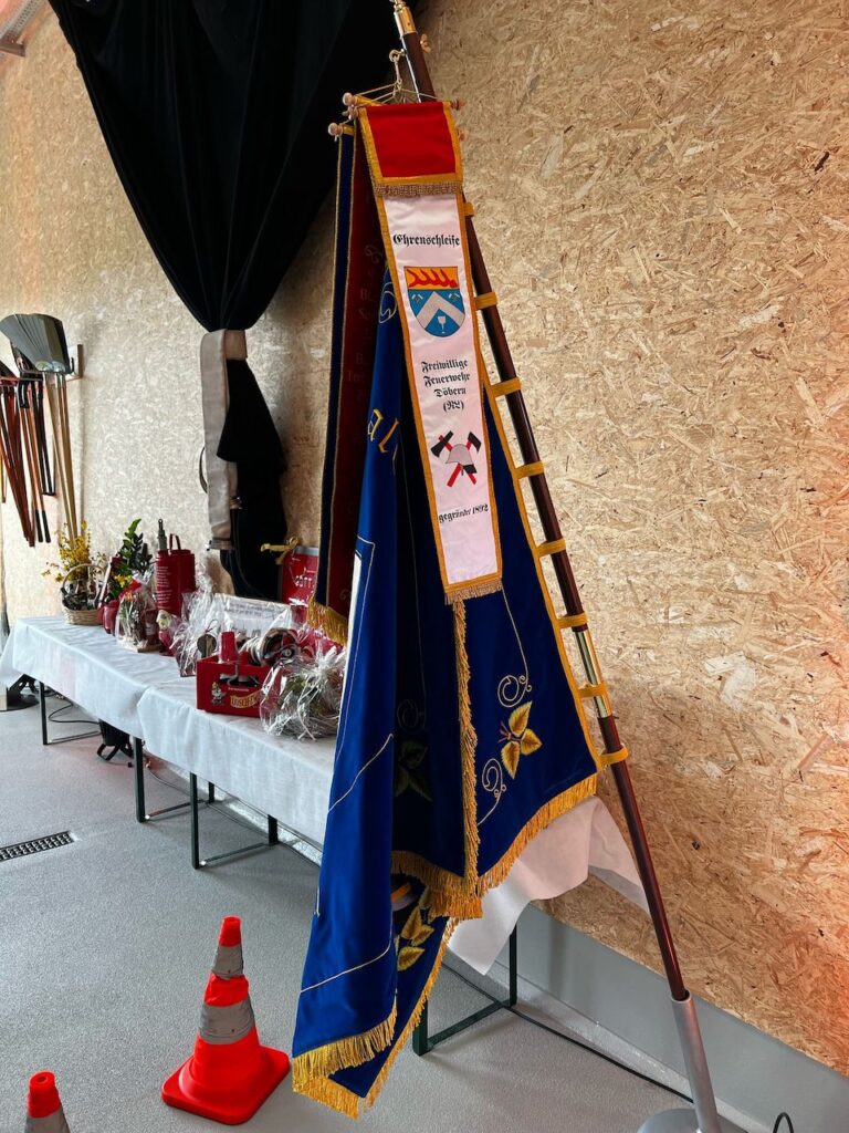 Eine besondere Überraschung erwartete die Kameraden aus Halbendorf: eine neue Feuerwehrfahne. “Nur wenige waren eingeweiht, und alle haben dichtgehalten”, so Jörg Funda, Bürgermeister von Schleife. Die Emotionen in den Gesichtern der Kameraden sprachen Bände. Unser stellvertretender Ortswehrführer Marcel Reif überreichte zudem die Ehrenschleife von Döbern für die neue Fahne.