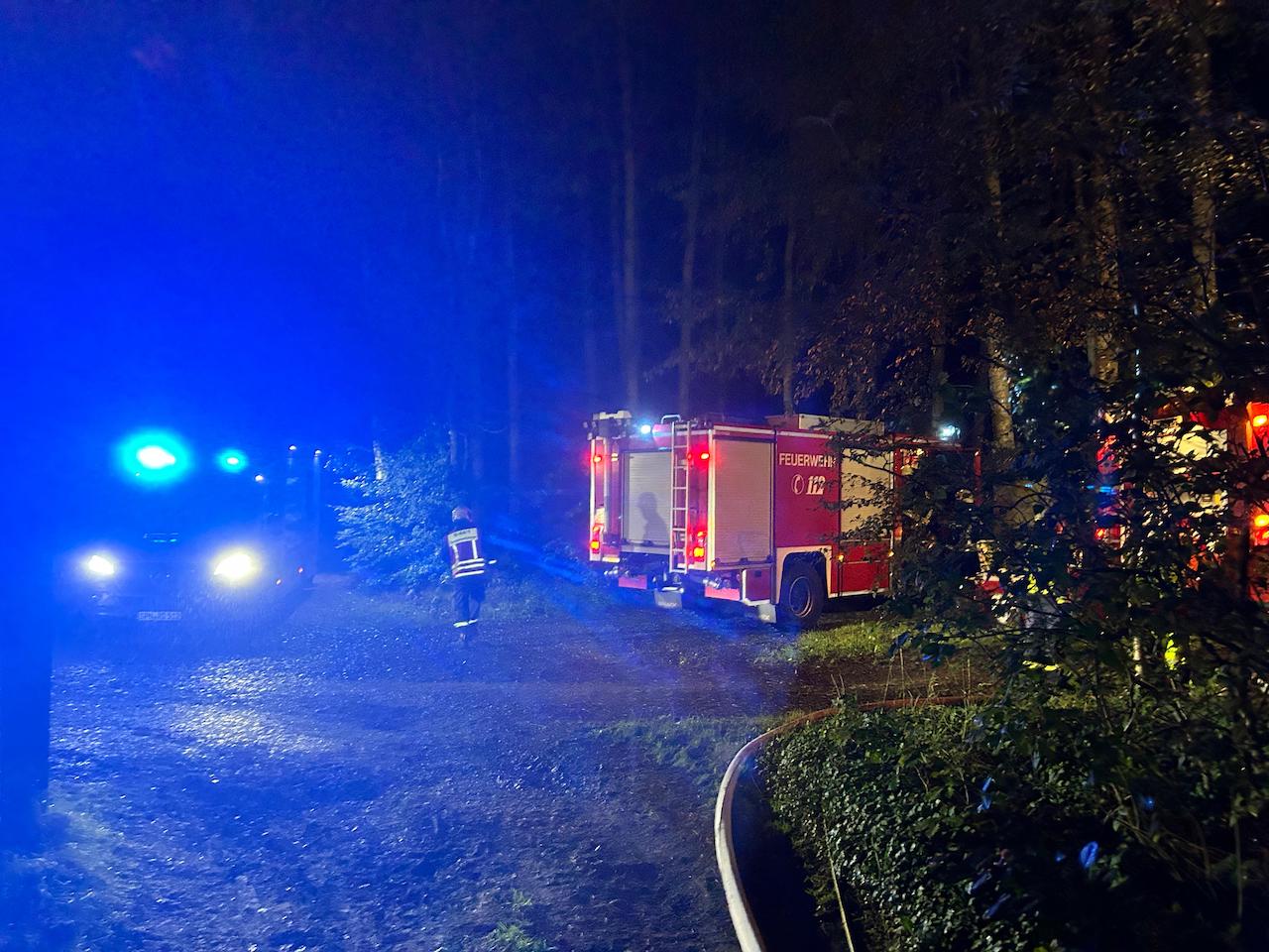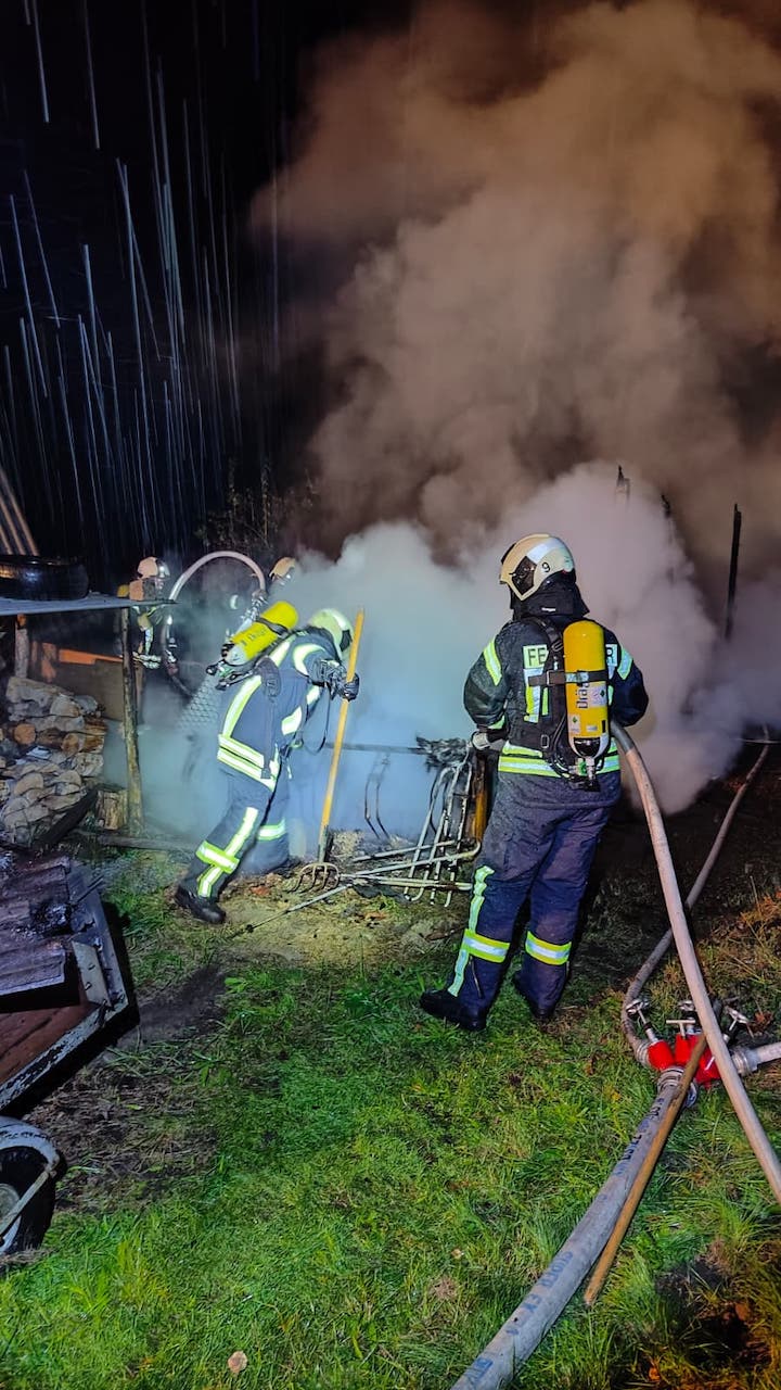Umgehend ging ein Trupp unter Atemschutz mit einem C-Strahlrohr vor, um eine Ausbreitung auf eine angrenzende Hecke zu verhindern.